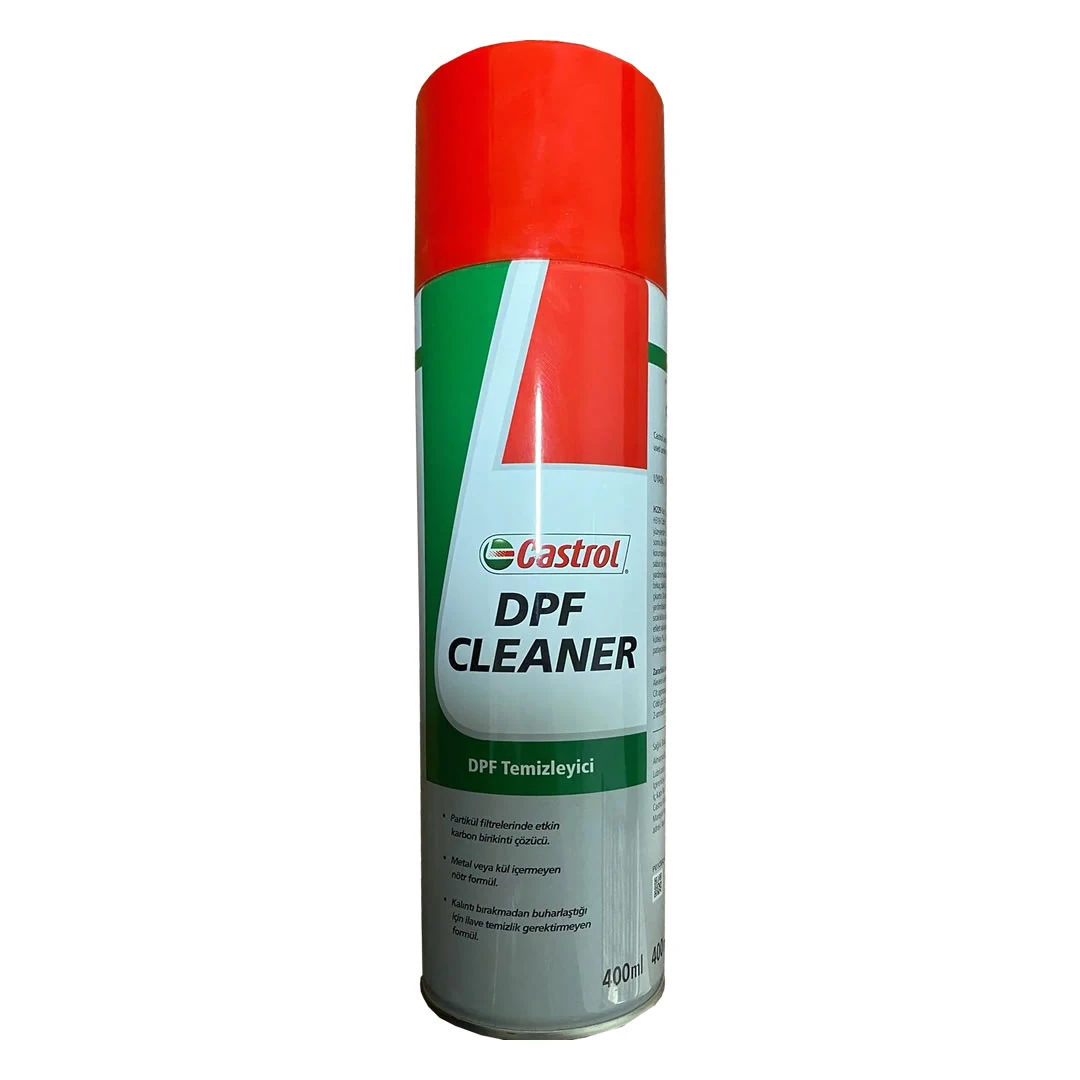 Dizel partikül filtreler için aerosol temizleyici. Dizel partikül filtreleri (DPF) , hava kirliliğini önlemeye yardımcı olmak için araç egzozundan çıkan kurumları yakalar. Çoğunlukla kısa ve düşük hızlı seyirler için kullanılan bir aracın DPF’ si, partikülleri yakmaya yetecek kadar ısınmadığı için tıkanmaya başlayabilir. Castrol DPF temizleyici, zamanla oluşan kurum ve kül birikintilerini yakarak DPF’yi sökmeye veya özel aletler kullanmaya gerek kalmadan filtrenin yenilemesine yardım eder. Söküm işlemi olmadan DPF’nin performansını geri kazanmasına yardımcı olur. Partikül filtrelerinde etkin karbon birikinti çözücü. Metal veya kül içermeyen nötr formül. Kalıntı bırakmadan buharlaştığı için ilave temizlik gerektirmeyen formül.